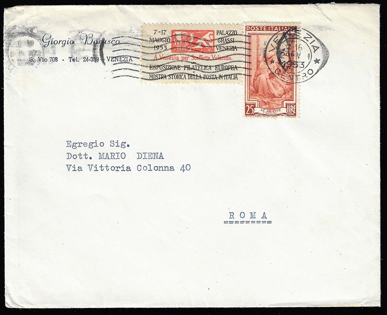 1953 - 25 cent. Lavoro (643), con a lato la vignetta erinnofila della manifestazione filatelica "A Venezia per staffetta volando", su busta da Venezia 29/5/1953 a Roma.