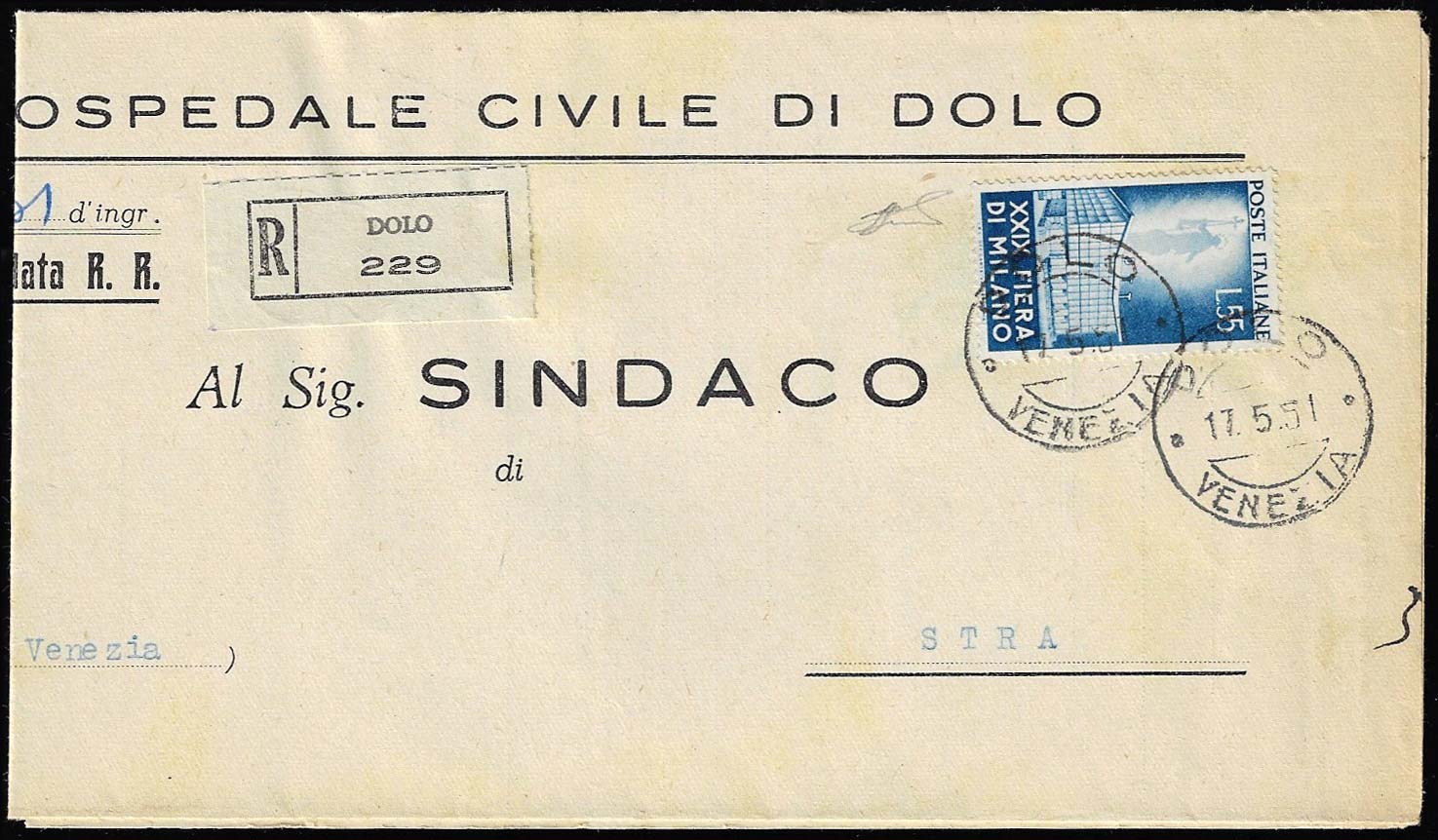 1951 - 55 lire Fiera di Milano (658), perfetto, isolato su plico raccomandato da Dolo 17/5/1951 a Stra. Raro uso isolato. Ferrario.