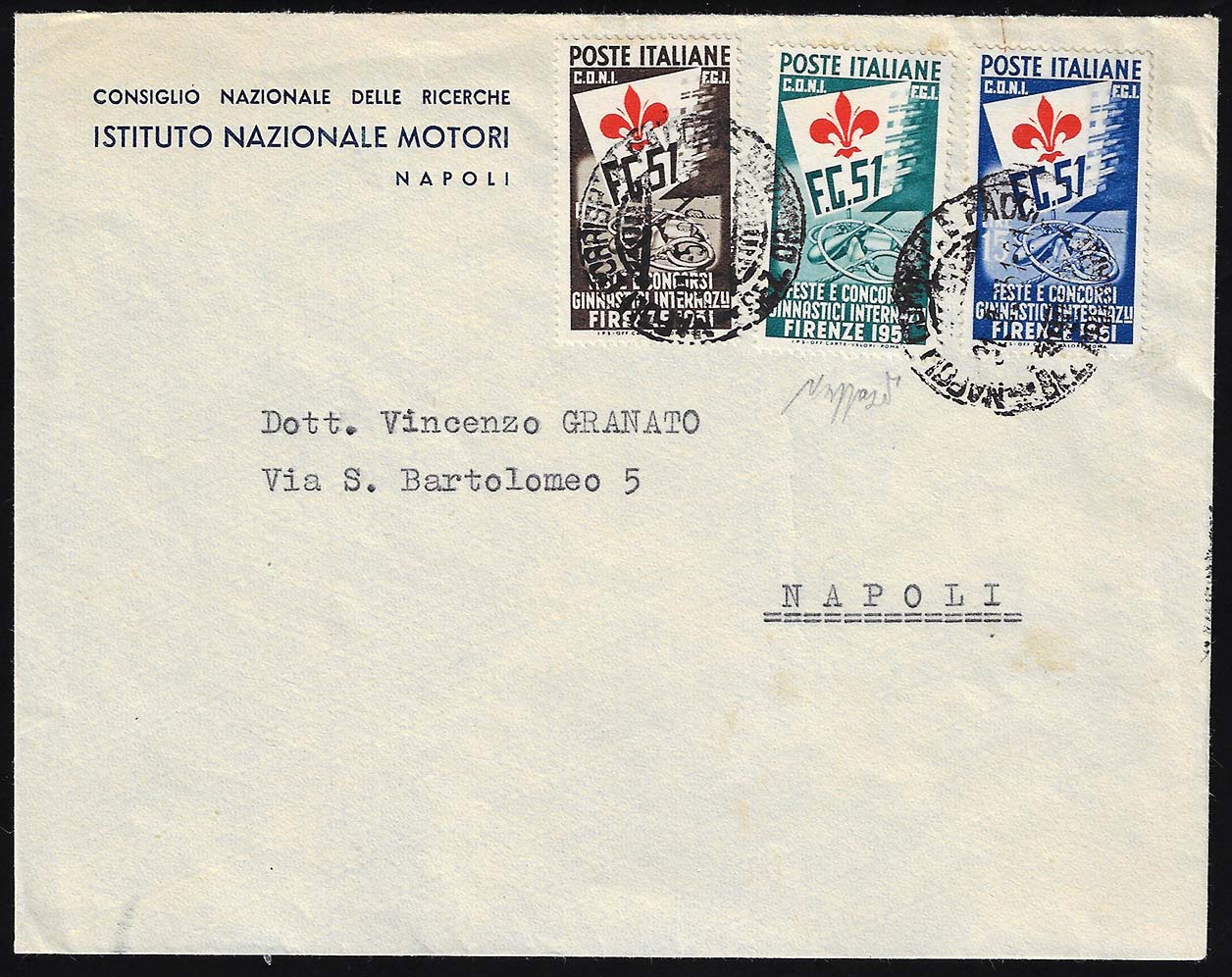 1851 - Ginnici, serie completa (661/663), perfetti, su busta da Napoli 31/5/1951 per città, bollo di arrivo al verso. Cert. Caffaz.
