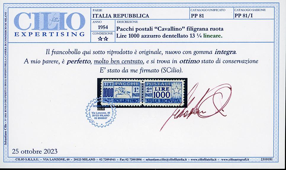 1954 - 1.000 lire Cavallino, filigrana ruota, dentellatura lineare (81/I), nuovo, gomma originale integra, perfetto e ottimamente centrato. Qualità lusso. Cert. Cilio e Ferrario.