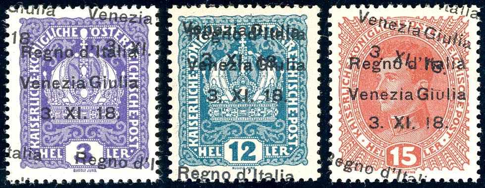VENEZIA GIULIA 1918 - 3 h. violetto, 12 h. verde azzurro e 15 h. bruno rosso, doppia soprastampa di cui una obliqua (1c,5c,6c), nuovi, gomma originale, lievissima traccia di linguella, perfetti. Il 12 h. presenta anche il decalco della soprastampa. Non comuni. Ferrario.