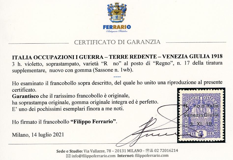 VENEZIA GIULIA 1918 - 3 h. soprastampato, varietà "R no" al posto di "Regno", pos. 17 della rara tiratura supplementare (1wb), gomma ... Read more