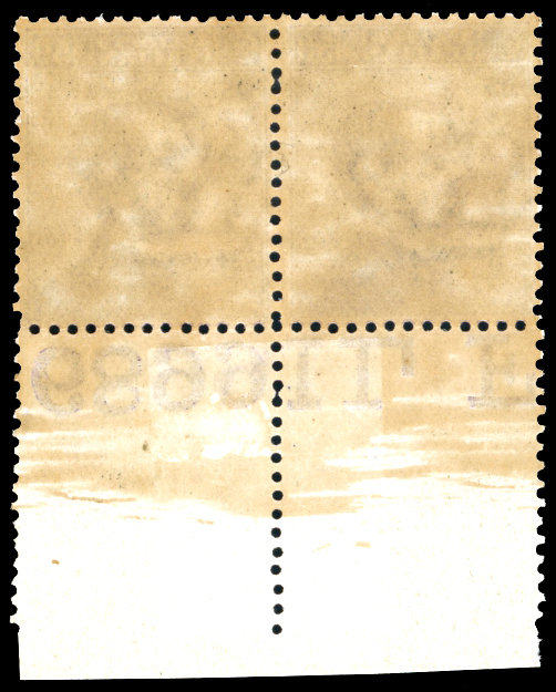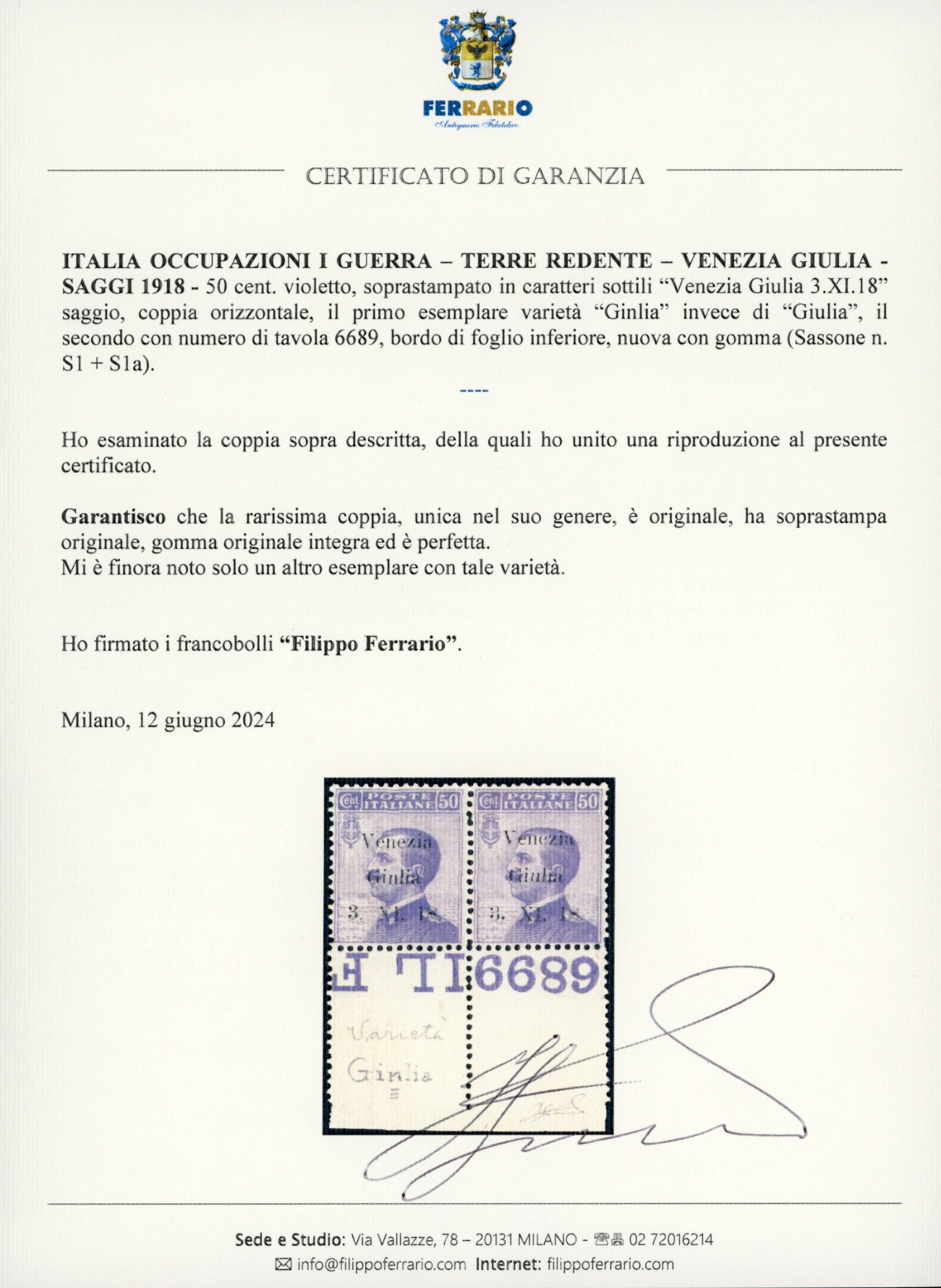 VENEZIA GIULIA SAGGI 1918 - 50 cent. violetto, soprastampa in caratteri sottili "Venezia Giulia 3.XI.18", coppia orizzontale bordo di foglio inferiore, il primo esemplare varietà "Ginlia" invece di "Giulia", il secondo con numero di tavola (S1+S1a), nuova, gomma originale integra, perfetta. INSIEME STRAORDINARIO ED UNICO! Cert. Ferrario.