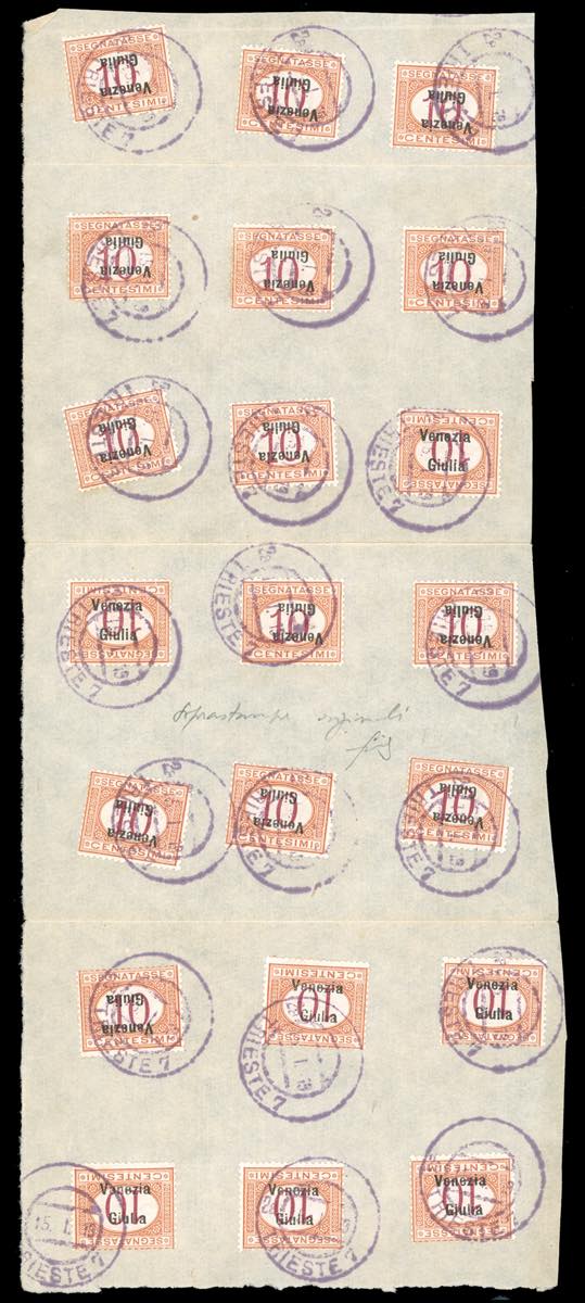VENEZIA GIULIA SEGNATASSE 1918 - 10 cent. soprastampa capovolta (2a), 21 esemplari perfetti, usati su grande frammento con annullo di ... Read more