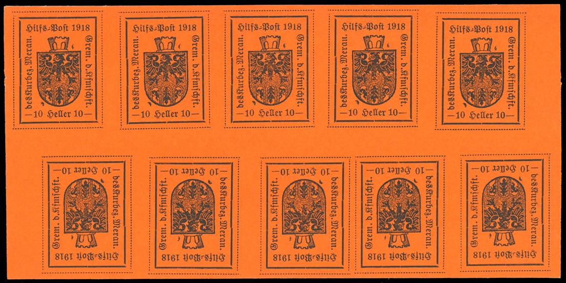 MERANO FOGLIETTI 1918 - 10 h. arancio, IV tipo, foglietto di 10 esemplari (12A), senza gomma come sempre, perfetto. Molto bello. Ferrario.