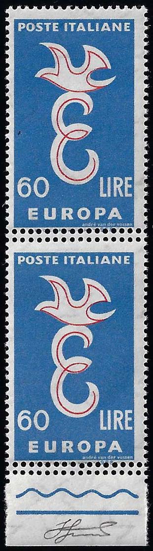 1958 - 60 lire Europa CEPT, doppia dentellatura in basso (839a), coppia verticale, bordo di foglio, gomma integra, perfetta. Ferrario.