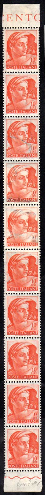 1961 - 10 lire Michelangiolesca, striscia verticale di dieci, tre esemplari stampati su carta ricongiunta (901l), gomma integra, perfetta. ... Read more