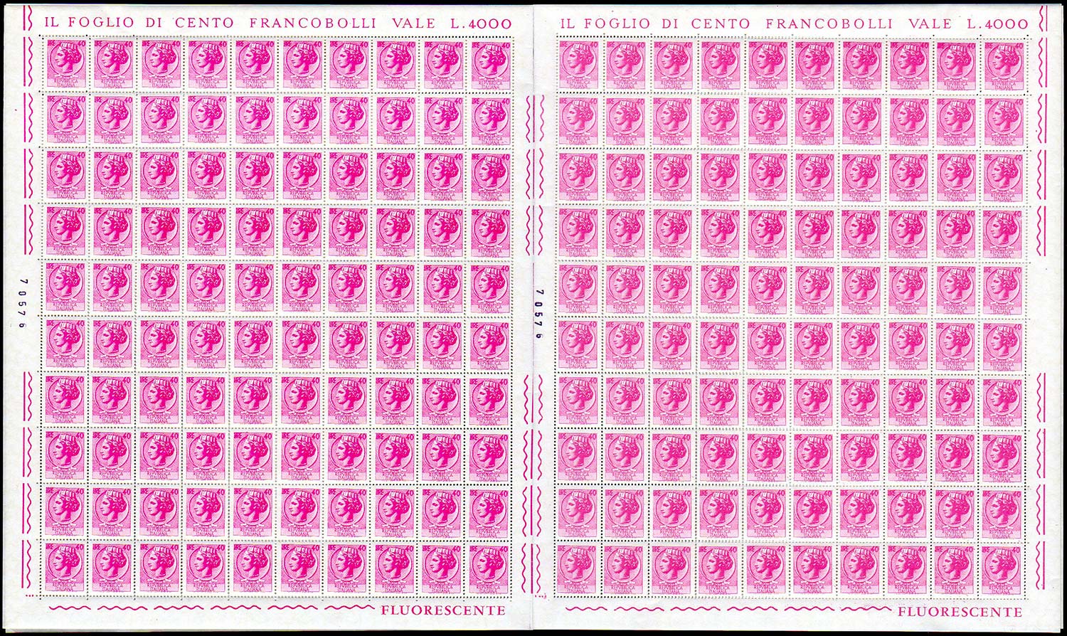 1974 - 40 lire Siracusana, falso per posta di Milano (F1075), foglio doppio di 200 esemplari con interspazio di gruppo al centro, gomma ... Read more