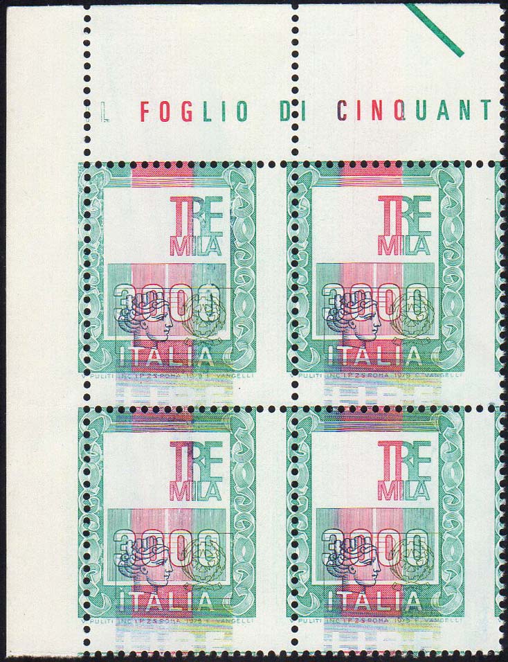 1978 - 3.000 lire Alti valori (1440), centro fortemente spostato e dentellatura verticale e orizzontale spostata, blocco di quattro, angolo ... Read more