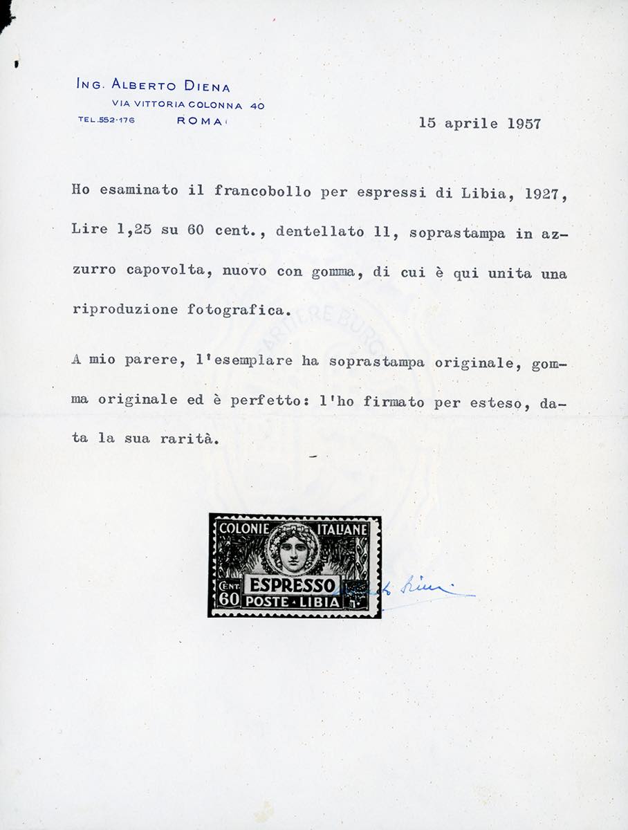 ESPRESSI 1927 - 1,25 lire su 60 cent., soprastampa capovolta e fortemente spostata a destra, senza sbarrette in alto (12ba), gomma ... Read more