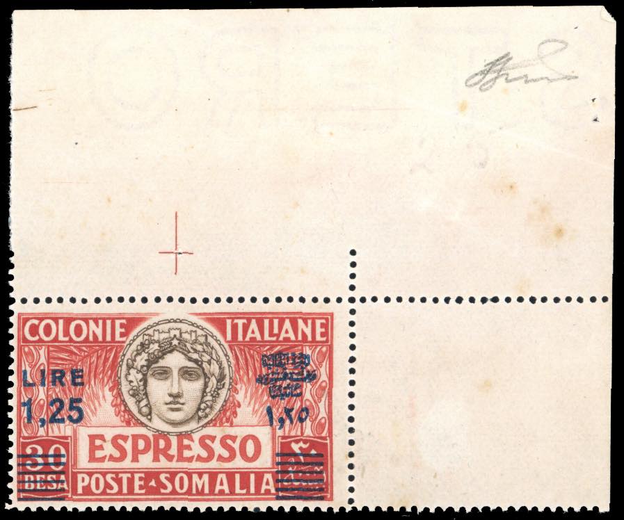ESPRESSI 1940 - 1,25 lire su 30 b., dent. 14 (8), angolo di foglio, gomma originale integra, perfetto. Molto bello. Ferrario.