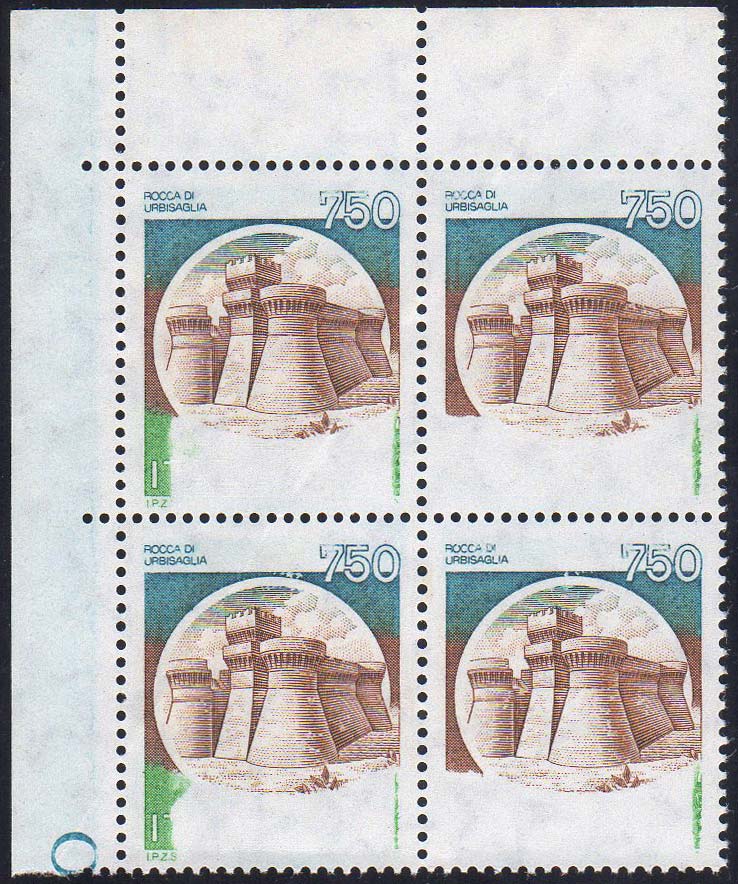 1990 - 750 lire Castelli, stampa del verde parzialmente mancante (Sass. spec. 1142AAa, blocco di foglio, angolo di foglio, perfetto.