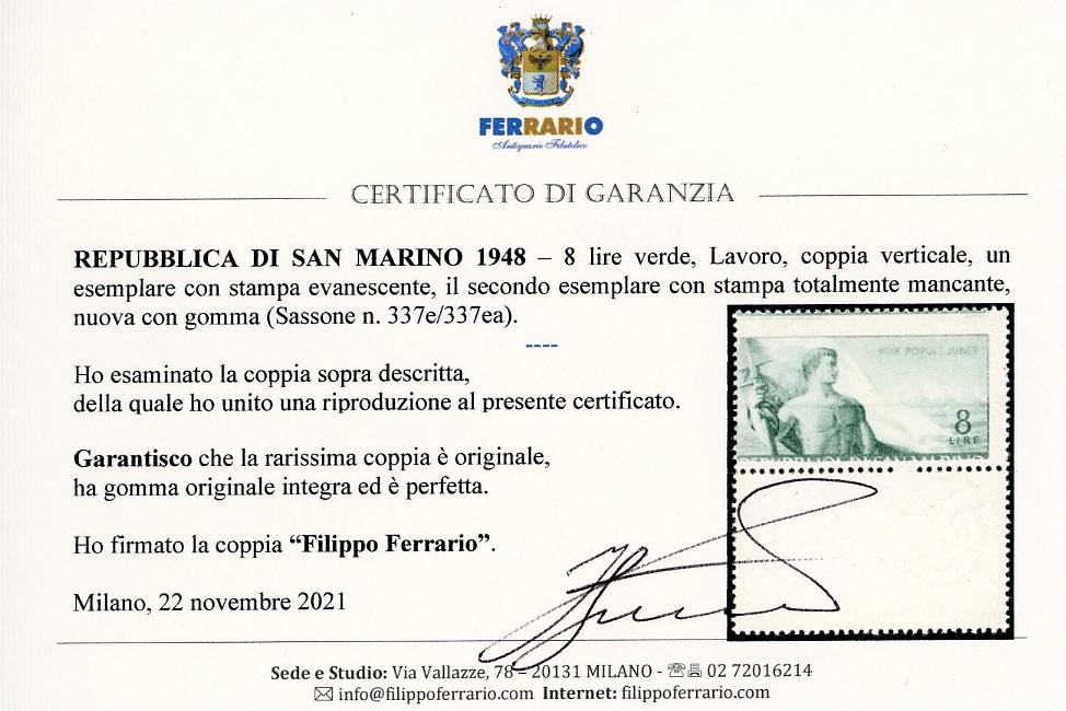 1948 - 8 lire Lavoro, stampa totalmente mancante in coppia con un esemplare con stampa evanescente (337ea), gomma originale integra, perfetto. Molto raro. Cert. Ferrario.