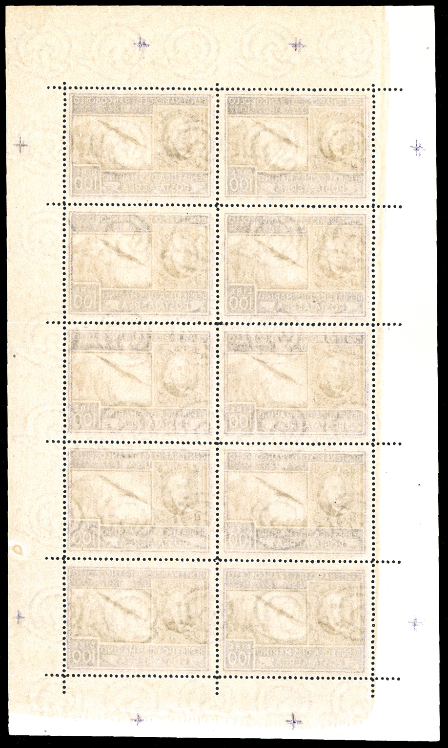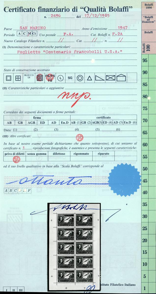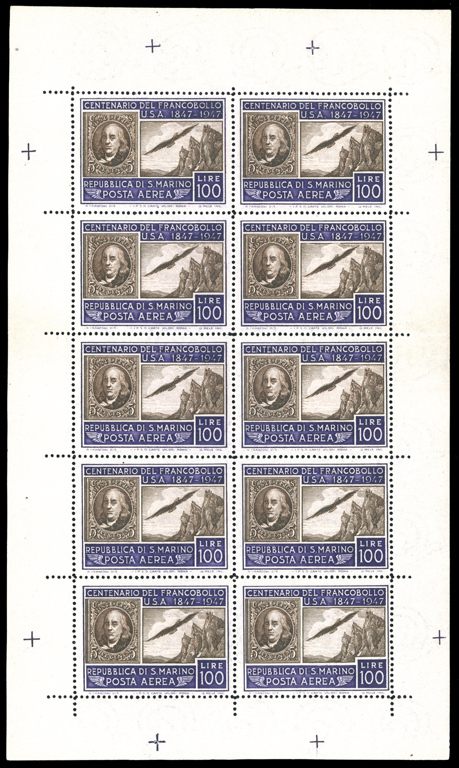 1947 - 100 lire Centenario Francobollo Americano, minifoglio (8), nuovo, gomma originale integra, lieve piega in corrispondenza della dentellatura, perfetto. Molto fresco. Cert. Finanziario Bolaffi 80%.