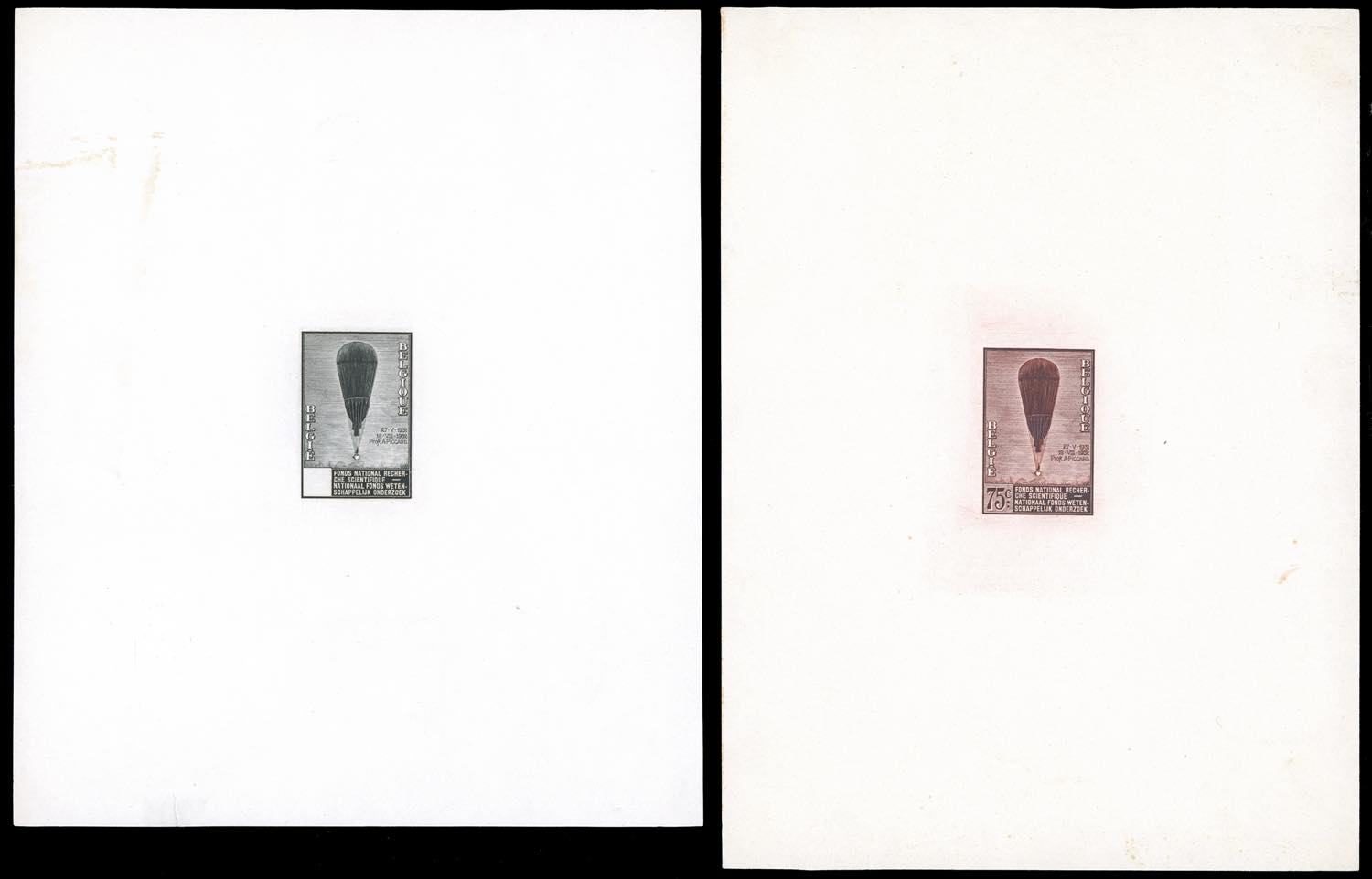 BELGIO 1932 - Ascensione del pallone del Prof. Piccard nella stratosfera, una prova di lusso in nero senza valore ed una prova di lusso del 75 cent. (Unif.353), molto belle.