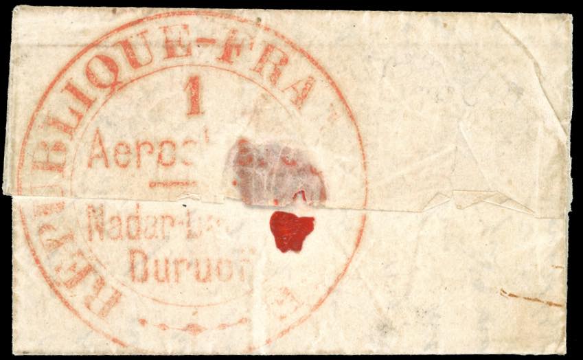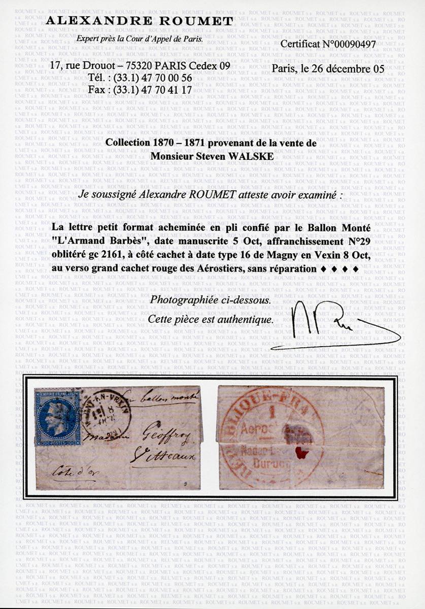 FRANCIA POSTA AEREA 1870 - 20 cent. Napoleone laureato dentellato, su piccolo Ballon Montè da Magny en Vexin 8/10/1870 a Vitteaux, trasportato con il pallone "L'Armand Barbès", al verso il cachè grande degli Aerostati in inchiostro rosso. Molto raro. Ex coll. Walske. Cert. Roumet.