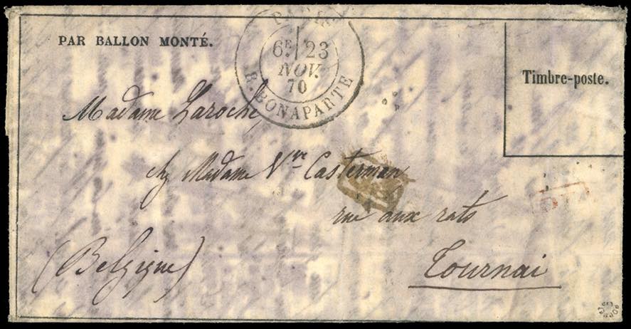 FRANCIA POSTA AEREA 1870 - LETTRE-JOURNAL "Gazzette des Absents" n. 9 da Parigi 23/11/1870 a Tournay, in Belgio, bollo di arrivo al verso, trasportato con il Ballon Montè "Ville D'Orleans". Questo volo segnò il record della distanza percorsa dai Ballon Montè, giungendo fino in Norvegia. L'aerogramma ha smarrito la sua affrancatura originaria perché faceva parte di un sacco della posta finito a mare, ripescato a Mandal. Raro e molto interessante. Cert. Roumet.