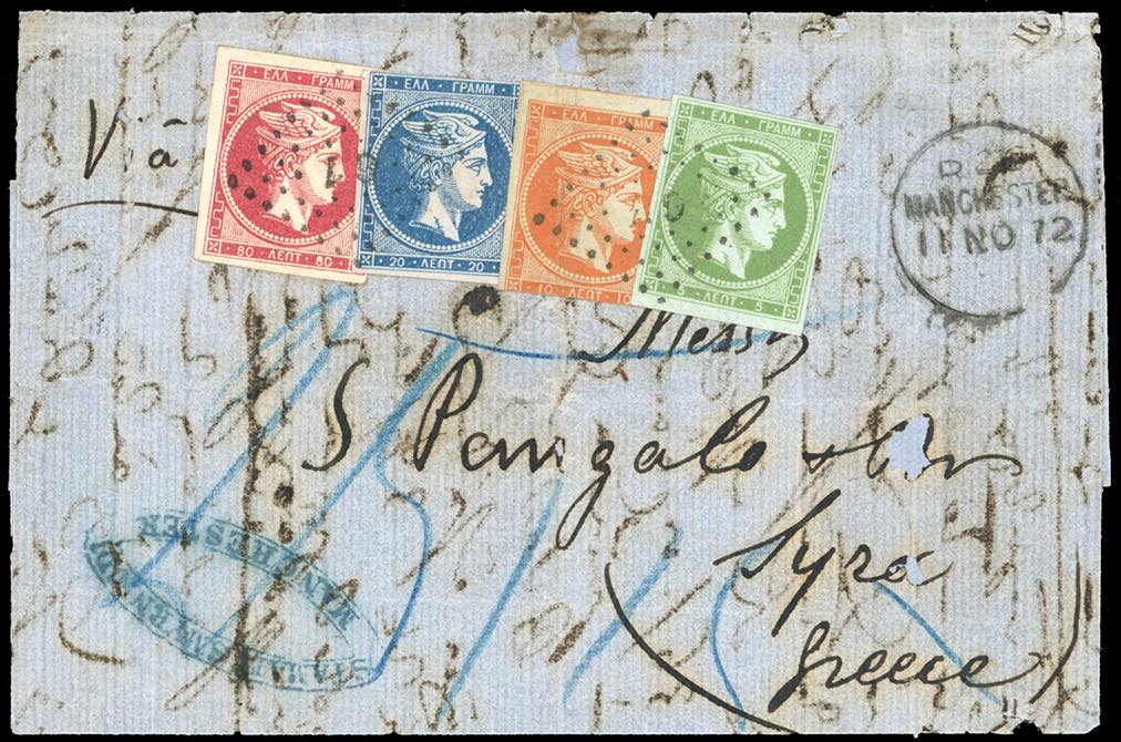 GRECIA 1872 - 5 lepta, 10 lepta, 20 lepta, 80 lepta Mercurio usati come segnatasse su lettera non affrancata da Manchester 11/11/1872 (Gran Bretagna), via Trieste, per Syra, tassa in blu di 115 lepta. Affrancatura quadricolore di ottimo aspetto. Cert. Eichele.