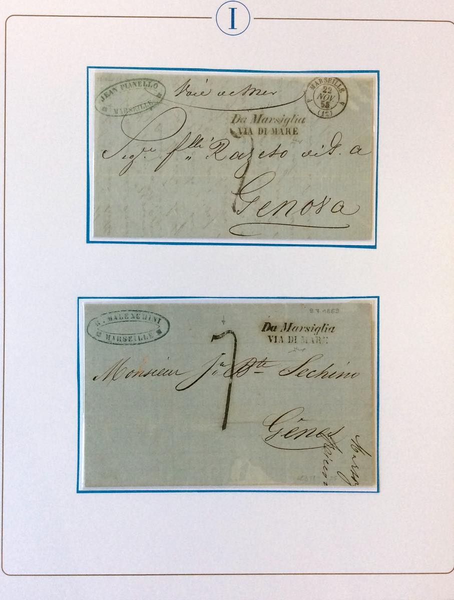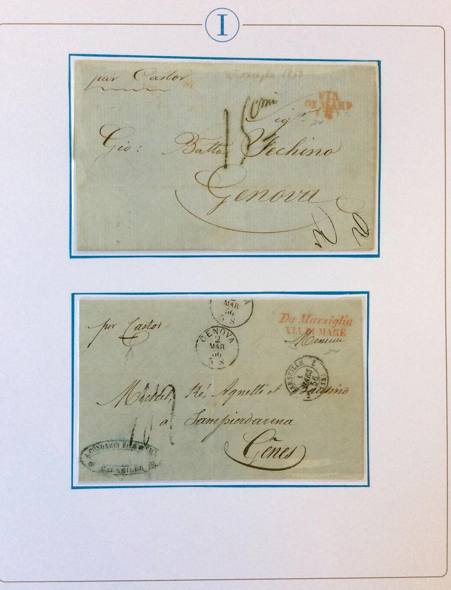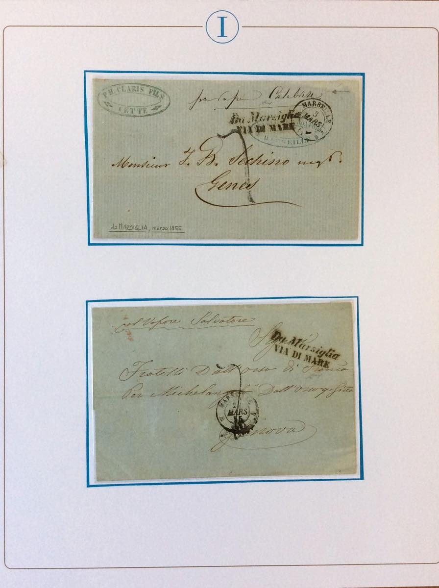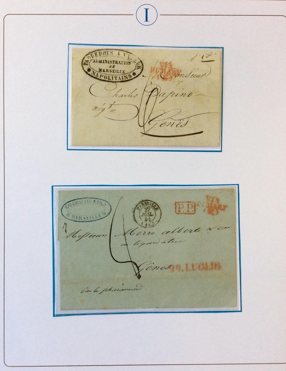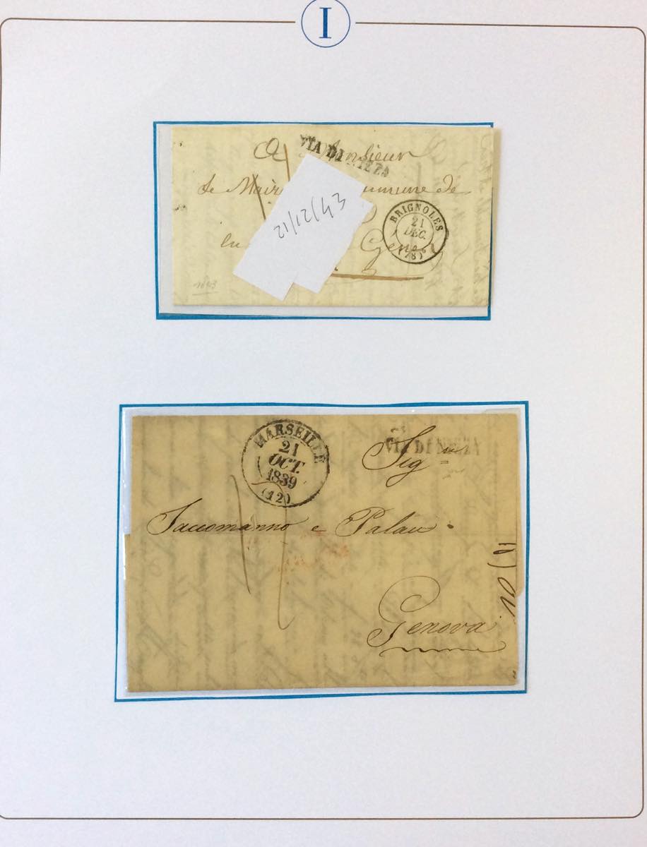 PREFILATELICHE VIE DI MARE 1819/1860 - Venti lettere dalla Francia e una da Barcellona, tutte indirizzate a Genova con bolli via di mare e/o indicazioni di piroscafi, montate su fogli d'album. Interessanti. Ex coll. Imperato.