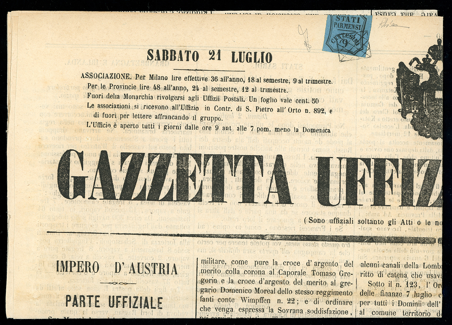 Lot 2112 - PARMA 1852/1859 - Cinque lettere e due giornali con ...