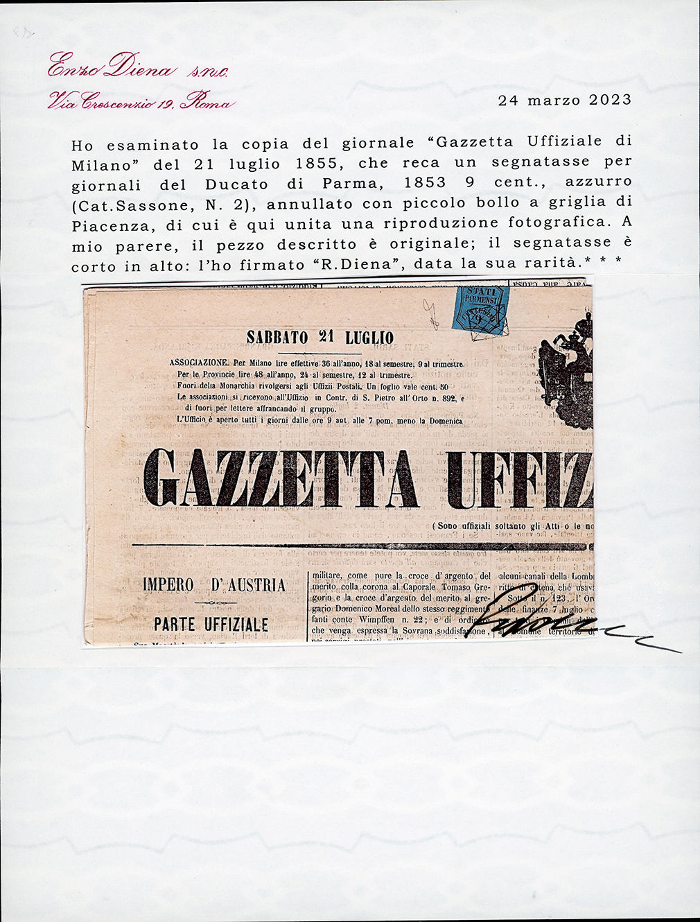 PARMA 1852/1859 - Cinque lettere e due giornali con affrancature del periodo. Notate alcune buone/ottime presenze e due certificati Diena. ... Read more