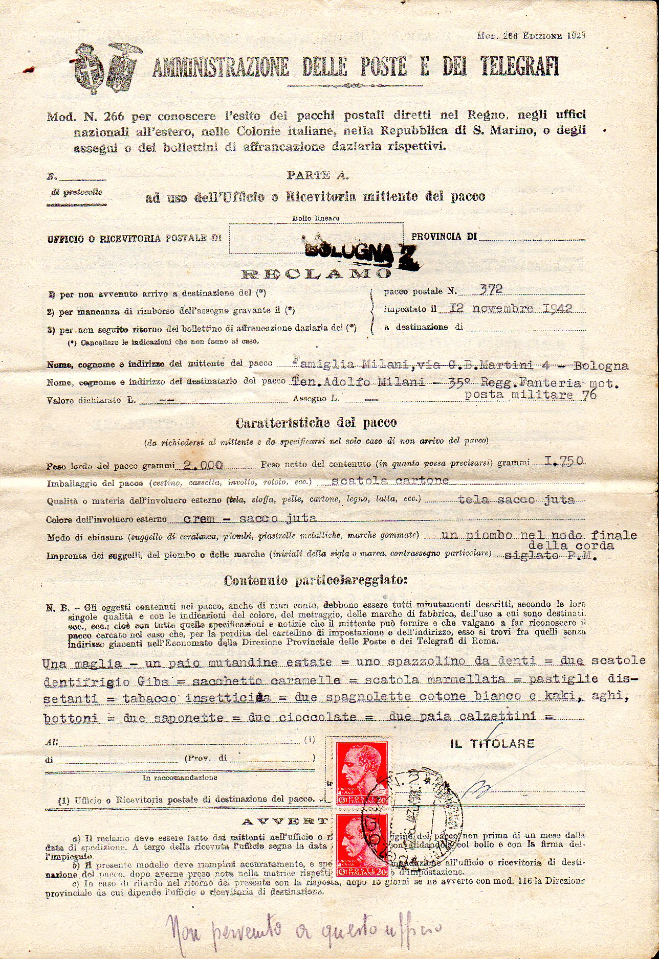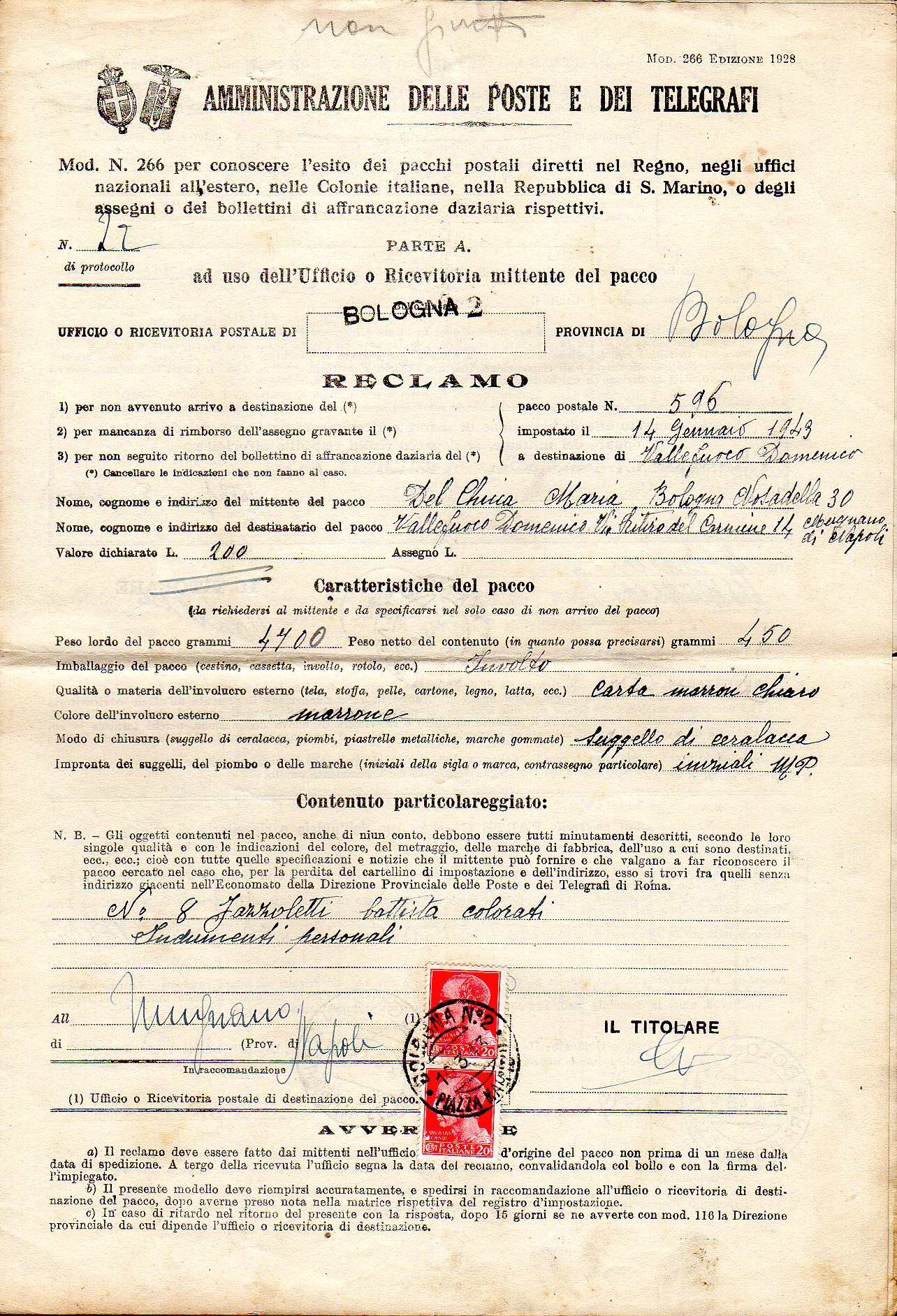 REGNO D'ITALIA 1943 - Quattordici moduli di reclami affrancati con coppia del 20 cent. Imperiale. Non comuni ed interessanti.