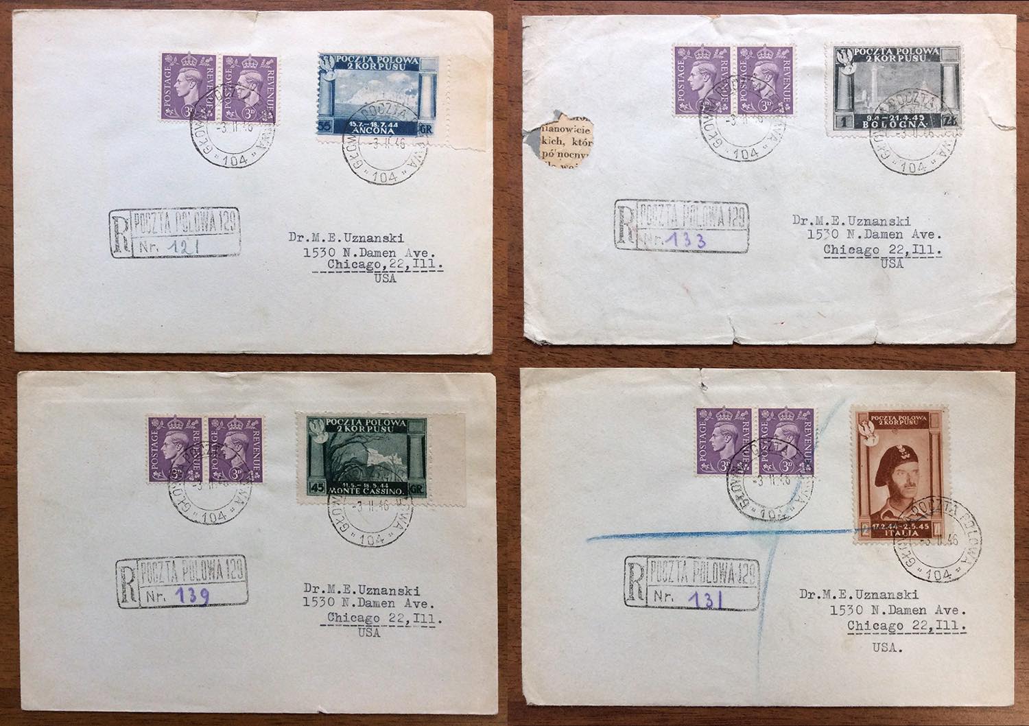 CORPO POLACCO 1946 - Quattro buste raccomandate in affrancatura mista con francobolli di Gran Bretagna per gli Stati Uniti, bolli di arrivo ... Read more