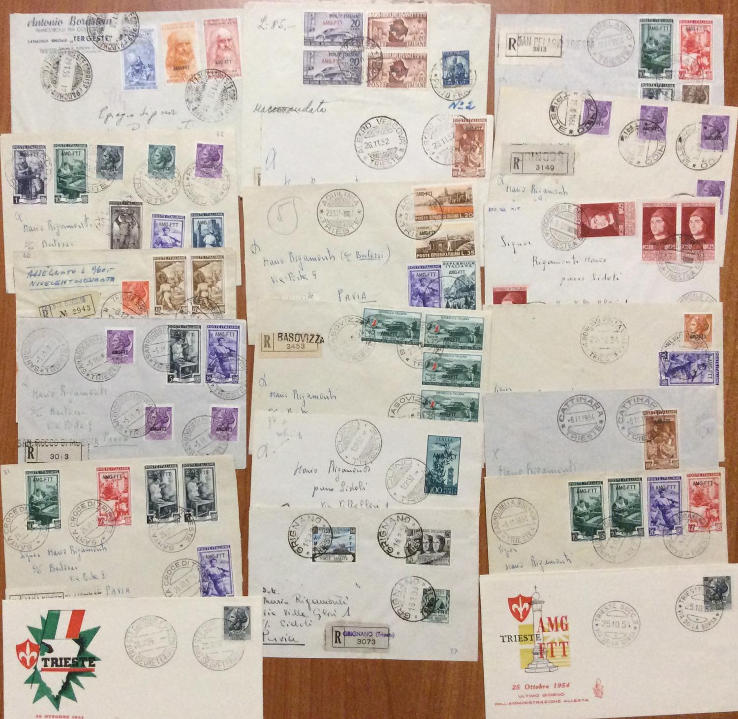 TRIESTE A AMG-FTT 1948/1954 - Collezione di diciotto buste affrancate con differenti annulli dei vari Comuni. Notata una rarissima raccomandata non filatelica da Albaro Vescovà. Per specialista.