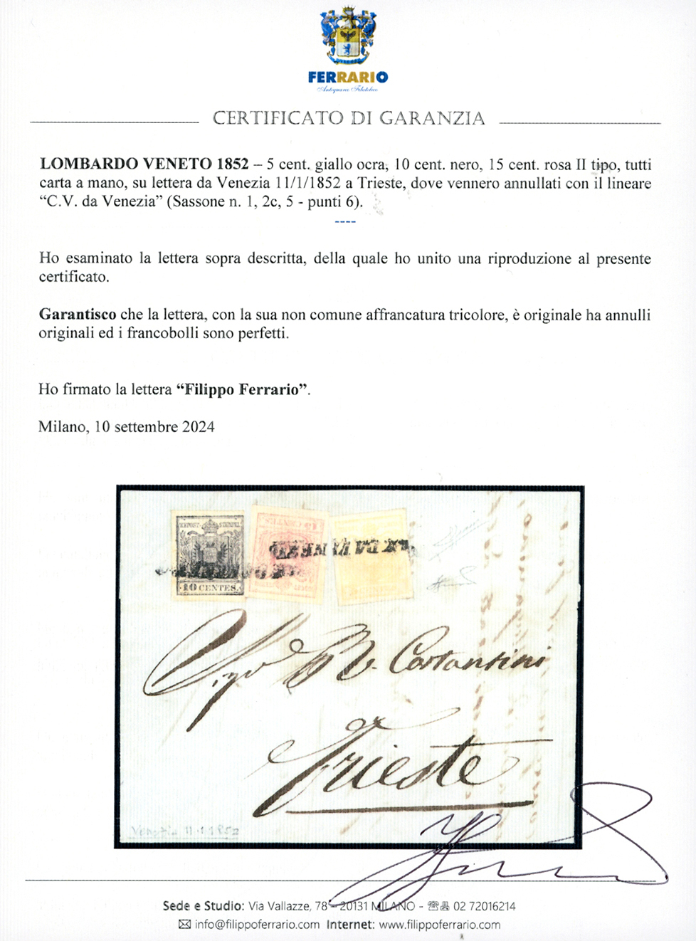 1852 - 5 cent. giallo ocra, 10 cent. grigio nero, 15 cent. rosa, II tipo, tutti carta a mano (1,2c,5), perfetti, su lettera da Venezia 11/1/1852 a Trieste, dove i francobolli vennero annullati con il lineare "C.V. da Venezia" (punti 6). Rara affrancatura tricolore. Sorani, cert. Ferrario.