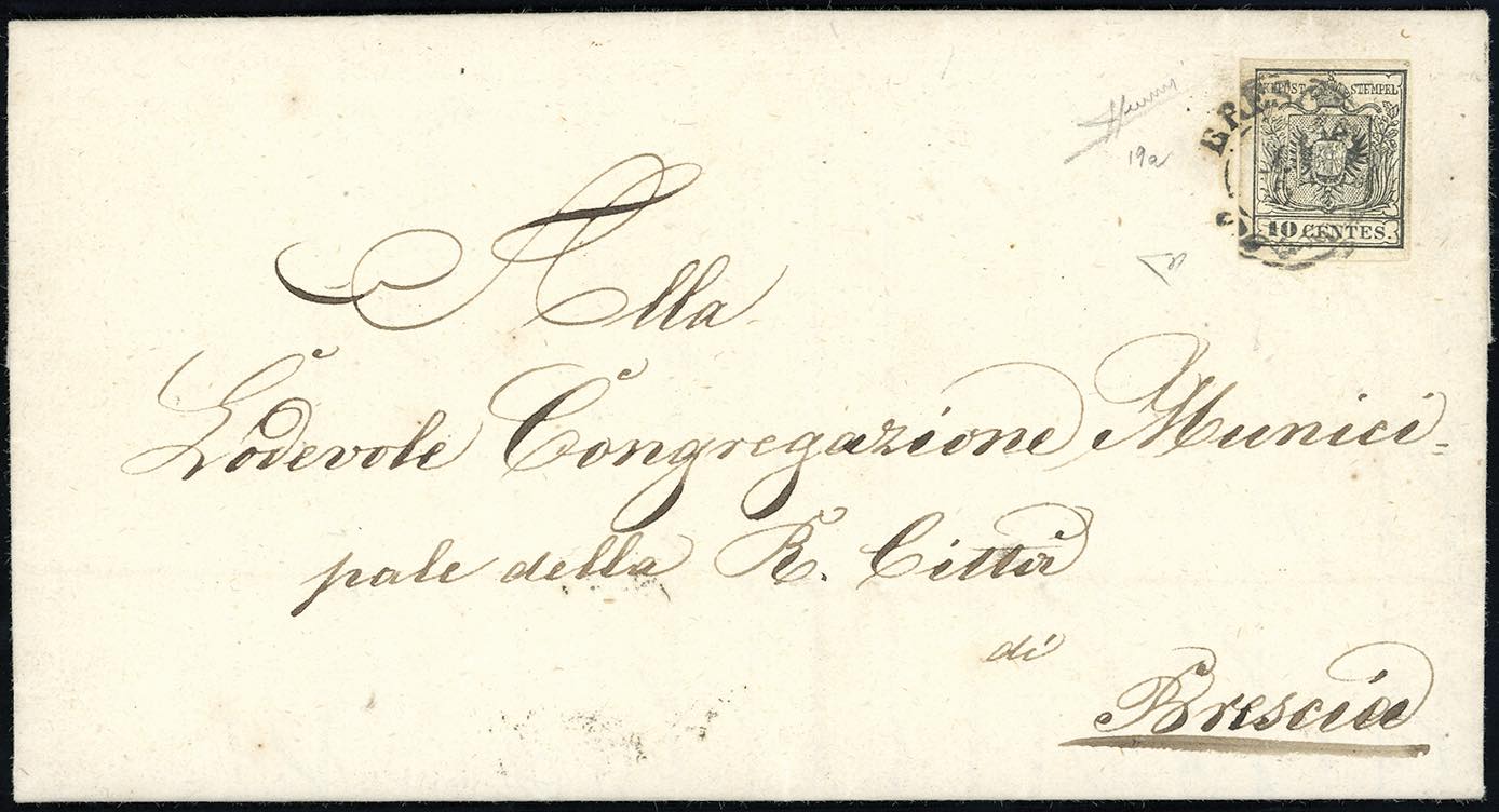 1858 - 10 cent. nero grigio, carta a macchina (19a), perfetto, isolato su lettera da Brescia 6/5/1858 per città. Tariffa pregevole con ... Read more
