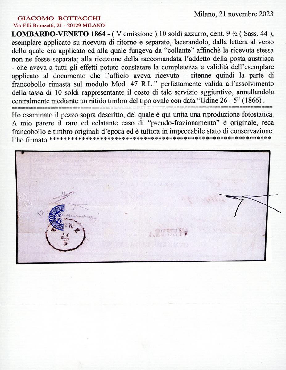 1866 - 10 soldi azzurro, dent. 9 1/2 (44), applicato al verso di ricevuta di ritorno, metà inferiore asportata, usato con bollo passante di Udine 26/5 (1866) apposto in arrivo, sul taglio del frazionamento in arrivo. Il francobollo, non annullato in partenza a Venezia, probabilmente era unito alla lettera e fu dimezzato in fase di spedizione della ricevuta al mittente, creando un'interessante e rara anomalia. Allegate pagine del "Collezionista" inerenti a questo ritrovamento. E.Diena, Giulio Bolaffi per esteso, cert. Sorani e Bottacchi.