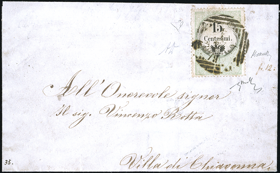 CAMERLATA, LOV punti 12 - 15 cent. marca da bollo calcografica (7), perfetta, su sovracoperta di lettera del 24/4 per Chiavenna. A. ed Enzo Diena, Chiavarello.