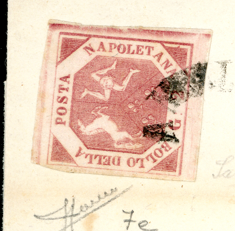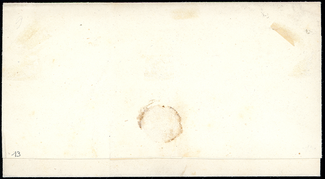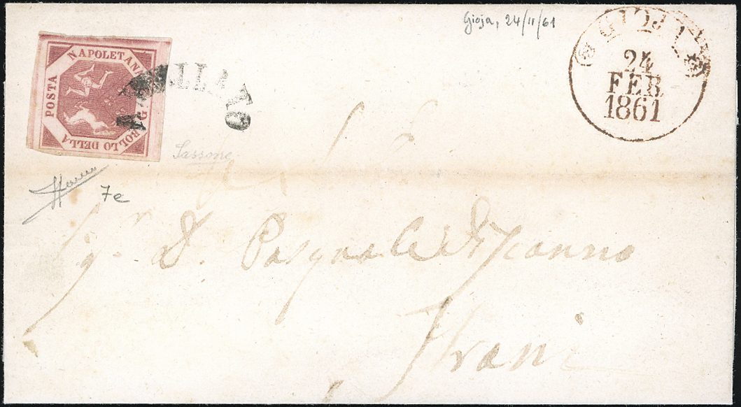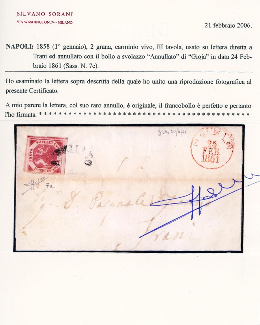 GIOJA, svolazzo tipo 1 + cerchio rosso punti 13 - 2 grana (7e), perfetto, su sovracoperta del 24/2/1861 per Trani. Rara. Sassone, cert. Sorani.
