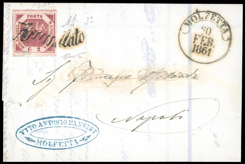 MOLFETTA, svolazzo + cerchio punti 8 - 2 grana (7d), perfetto, su fresca lettera del 20/2/1861 a Napoli. A.Diena, Ferrario.