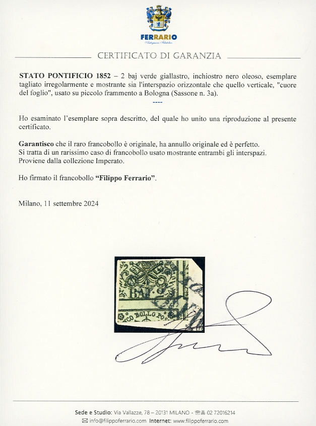 1852 - 2 baj verde giallastro, inchiostro nero oleoso (3a), esemplare tagliato irregolarmente e mostrante sia l'interspazio orizzontale che quello verticale, "cuore del foglio", usato su piccolo frammento a Bologna. Interessante e rarissimo, tre casi noti. Chiavarello, cert. Ferrario. Ex coll. Imperato.