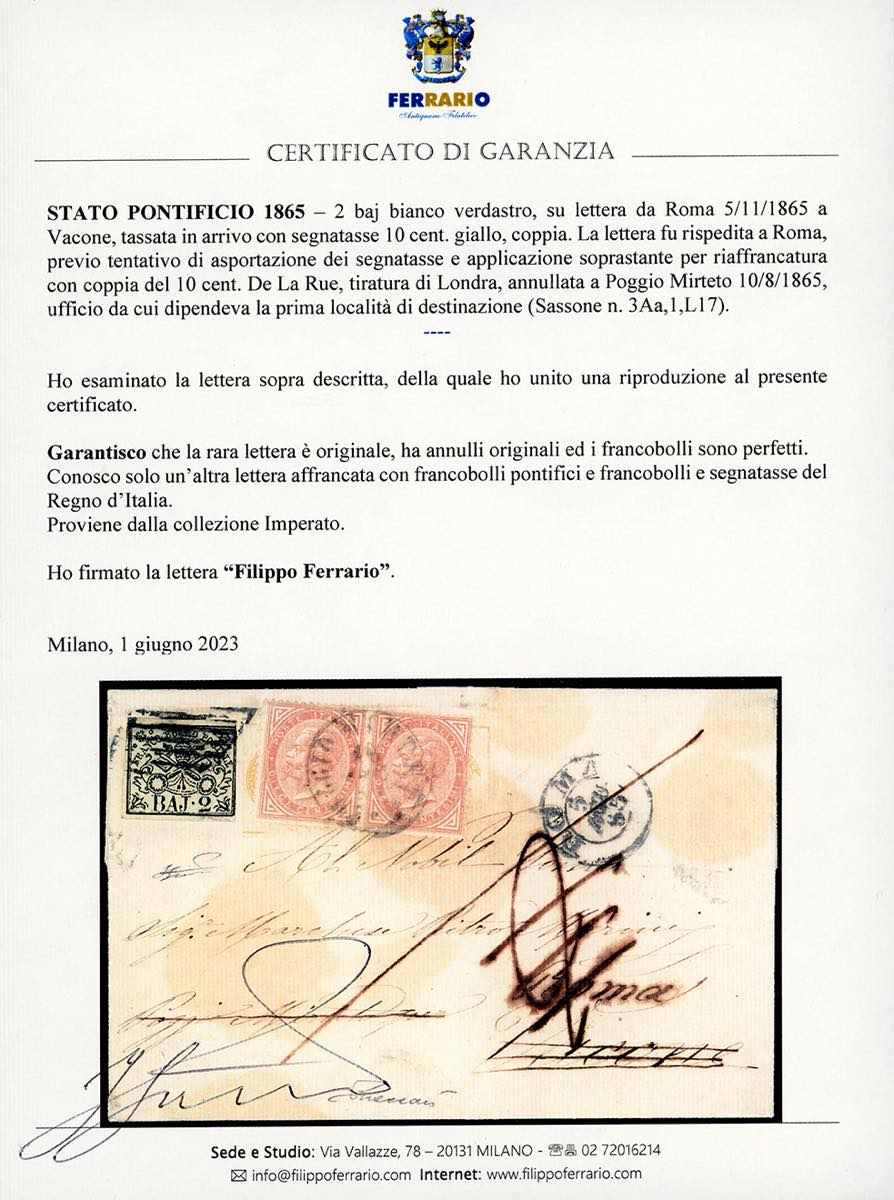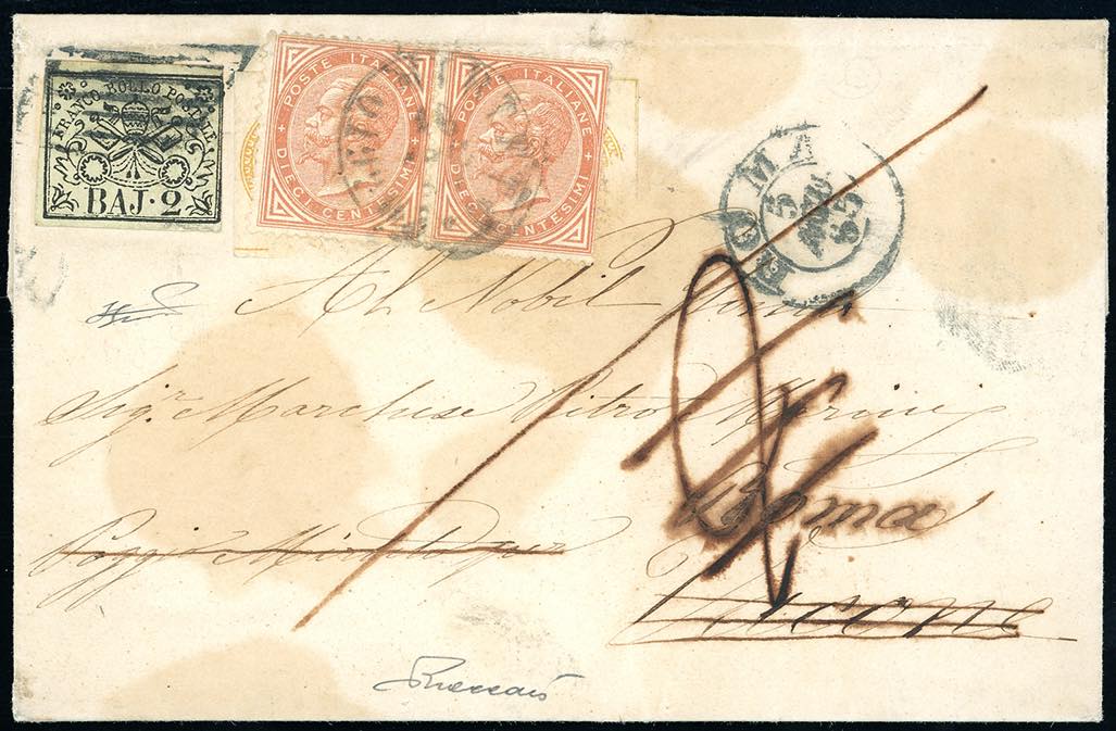 1865 - 2 baj bianco verdastro (3Aa), su lettera da Roma 5/11/1865 a Vacone, tassata in arrivo con segnatasse da 10 cent. giallo (1), coppia. La lettera venne quindi rispedita a Roma, previo tentativo di asportazione dei segnatasse e applicazione soprastante per riaffrancatura con coppia del 10 cent. De La Rue, tiratura di Londra (L17), annullata a Poggio Mirteto 10/8/1865, ufficio da cui dipendeva la prima località di destinazione. Eccezionale compresenza, sullo stesso documento, di un francobollo pontificio con segnatasse e francobolli italiani. Rarità per specialista. Vaccari, cert. Ferrario. Ex coll. Imperato.