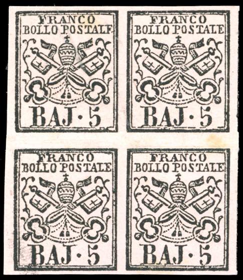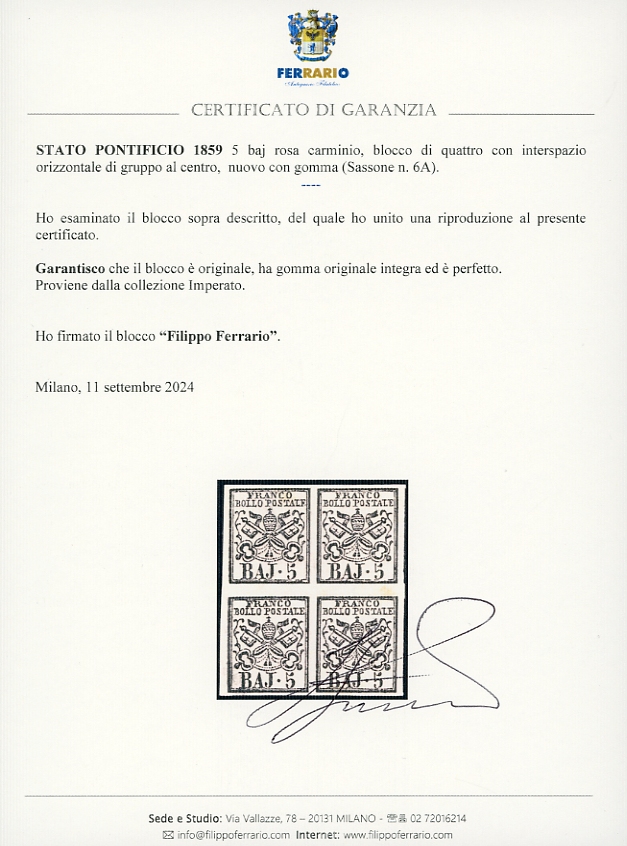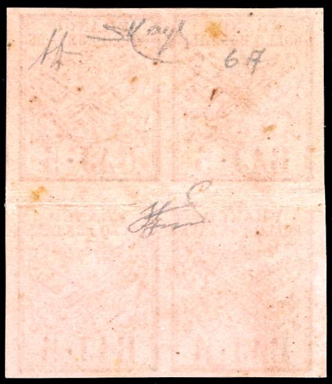 2859 - 5 baj rosa carminio (6A), blocco di quattro, interspazio orizzontale di gruppo al centro, gomma originale integra, perfetto e molto fresco. A.Diena, Raybaudi, cert. Ferrario. Ex coll. Imperato.