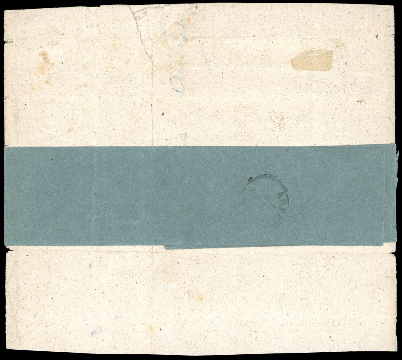 1869 - 3 cent. grigio, non dentellato, bordo di foglio inferiore, ottimi margini, 5 cent. azzurro chiaro (15,25), piega verticale in corrispondenza della fascetta, su involucro contenente stampati da Roma a Bibbiena 5/2/1869 , nel Regno d'Italia. Rarissimo uso postale, si conoscono solo 9 fascette affrancate con il 3 cent. grigio della seconda emissione. Grande rarità, di ottimo aspetto. Cert. Bottacchi e Ferrario.