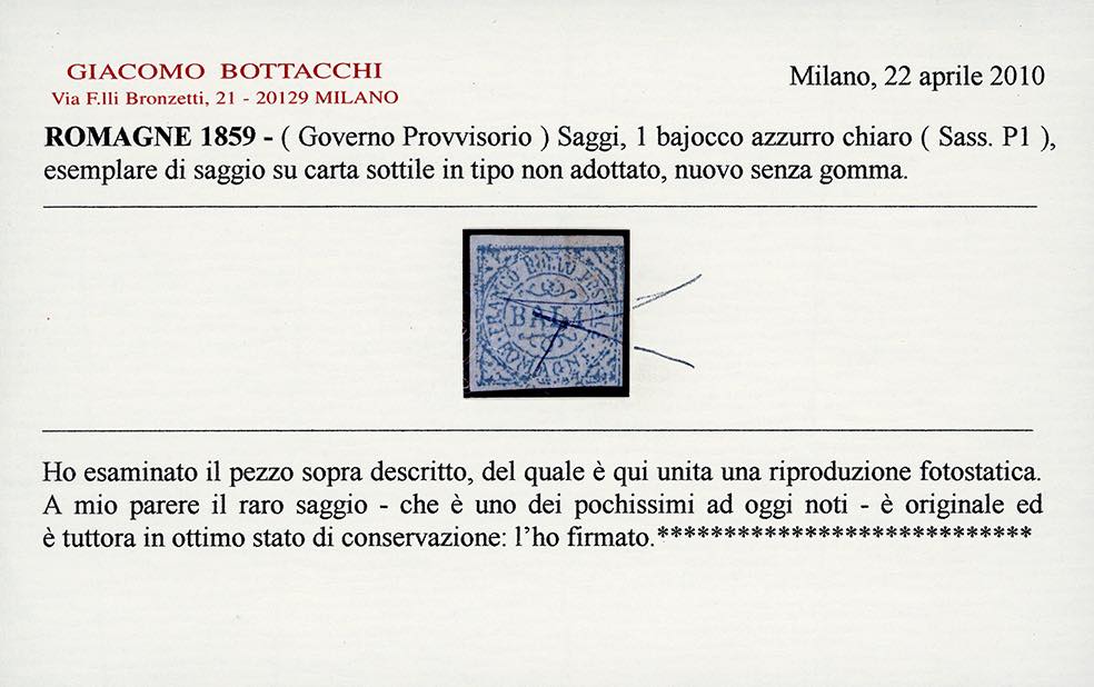 PROVE 1859 - 1 baj azzurro chiaro (P1), stampa a mano su carta sottile non gommata, perfetto. Molto bello e rarissimo, si conoscono meno di cinque esemplari. Cert. Oliva, Bottacchi, Ferrario.
