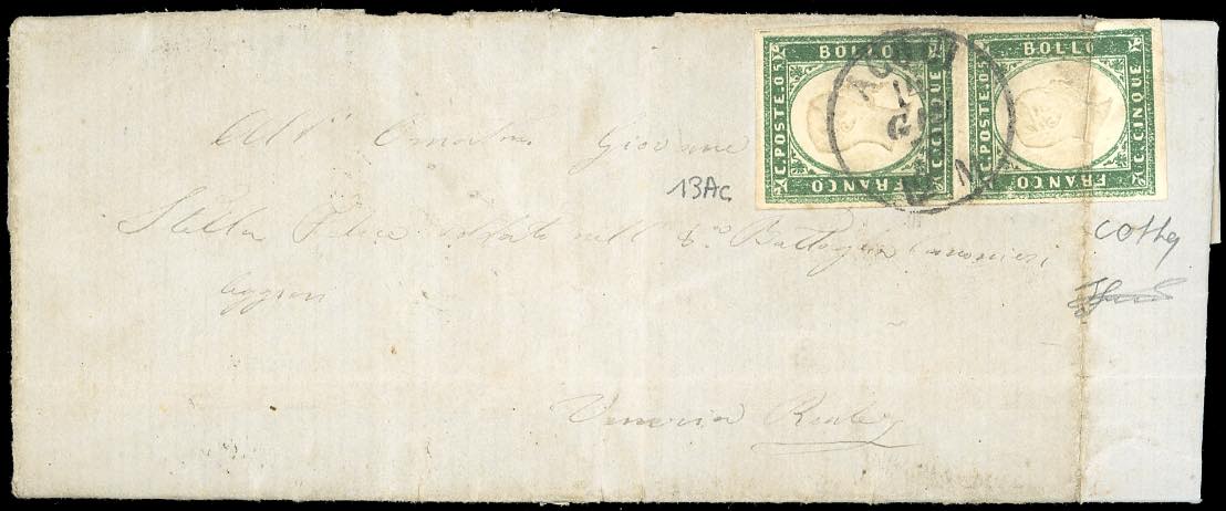 1857 - 5 cent. verde scuro (13Ac), coppia ben marginata, un esemplare piegato apposto "a cavallo", l'altro perfetto, su lettera diretta a ... Read more