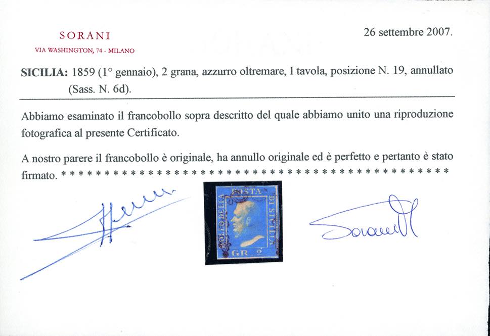 1859 - 2 grana azzurro oltremare, I tavola, carta di Napoli, pos. 19 (6d), annullato leggermente, perfetto. Molto fresco. Ferrario, cert. Sorani.