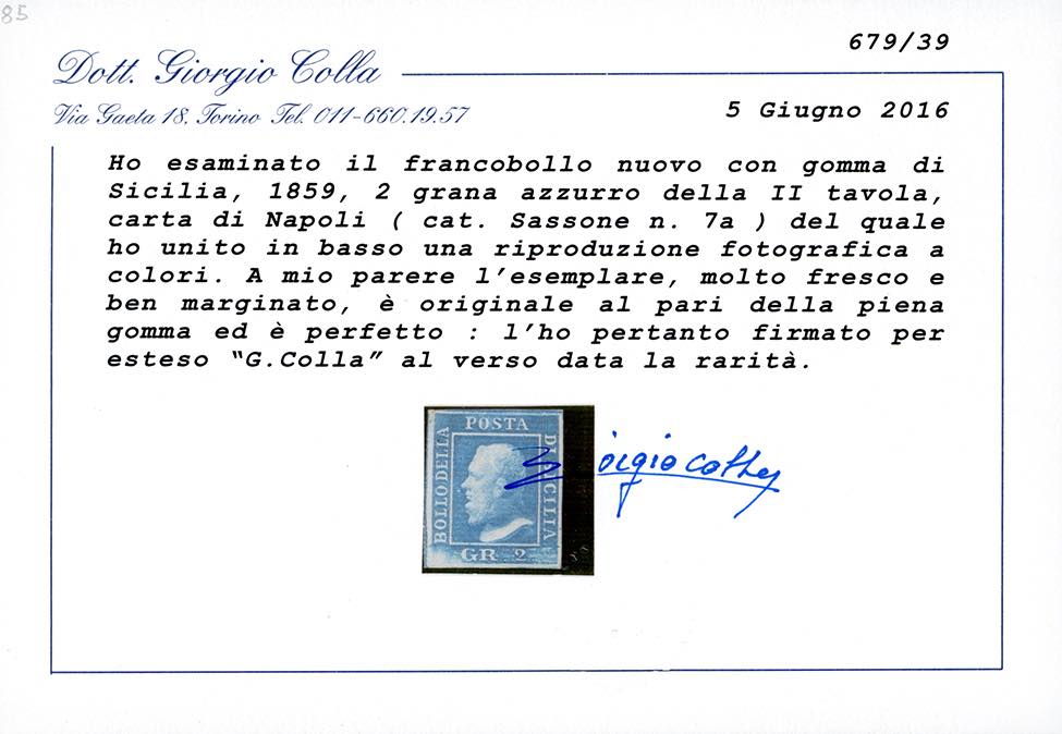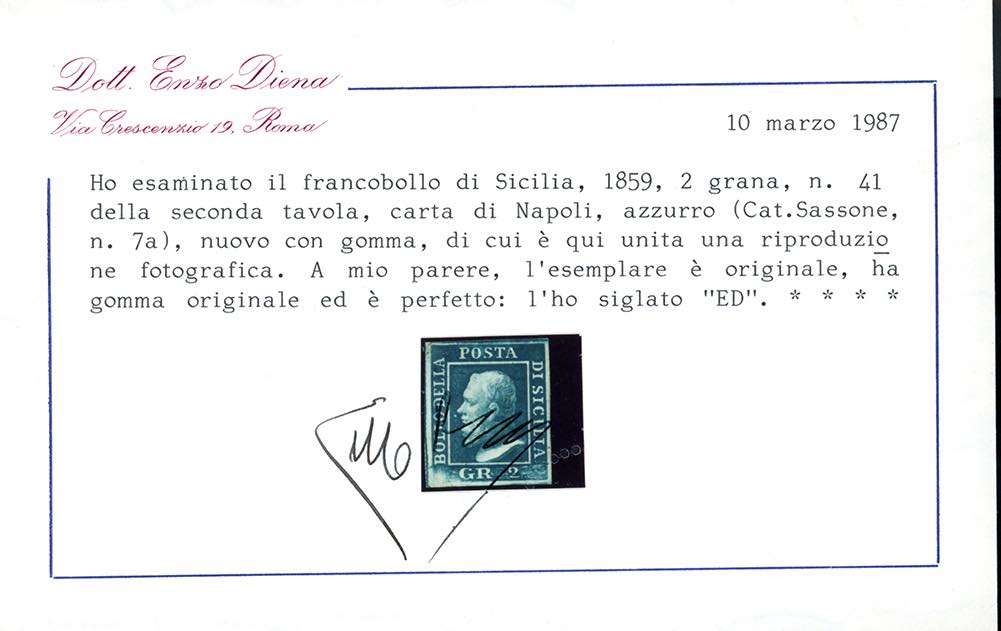 1859 - 2 grana azzurro, II tavola, carta di Napoli, pos. 41 (7a), gomma originale, perfetto e ben marginato. Raro e di ottima qualità. Em.Diena, Ferrario, cert. E.Diena e Colla.