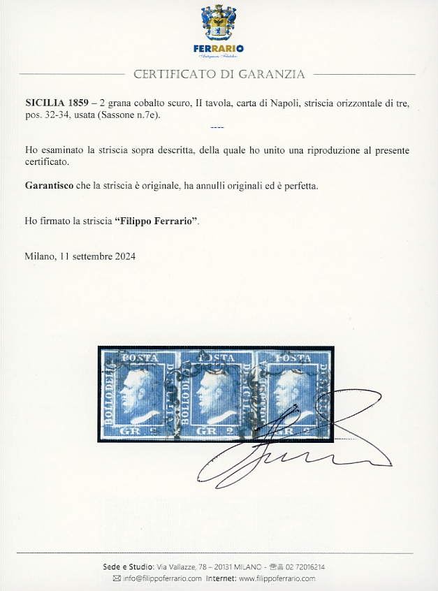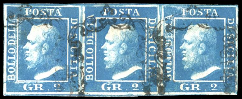 1859 - 2 grana cobalto scuro, II tavola, carta di Napoli (7c), striscia orizzontale di tre, pos. 32-34, usata, perfetta. Splendida. Em., A. ed E.Diena, Avanzo, cert. Ferrario.