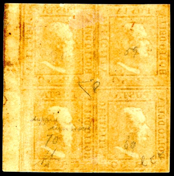 1859 - 50 grana lacca bruno (14), blocco di quattro,pos. 59-60, 69-70, bordo di foglio, testa d'avorio al verso, gomma originale, perfetto ... Read more