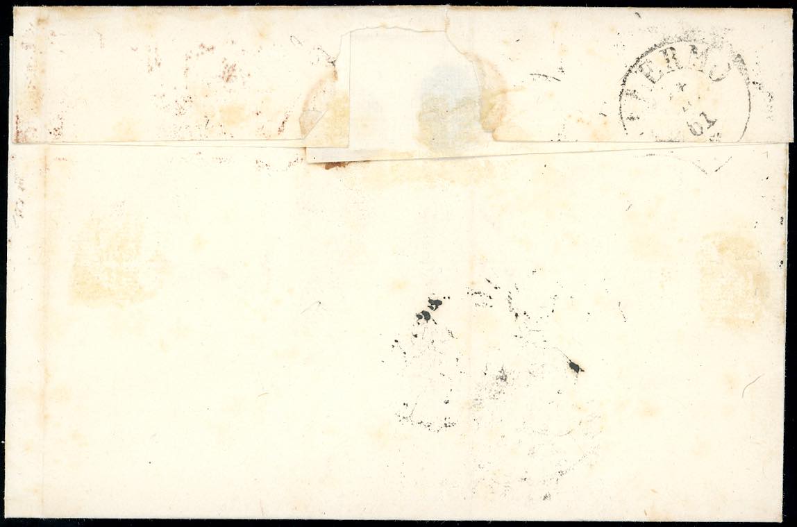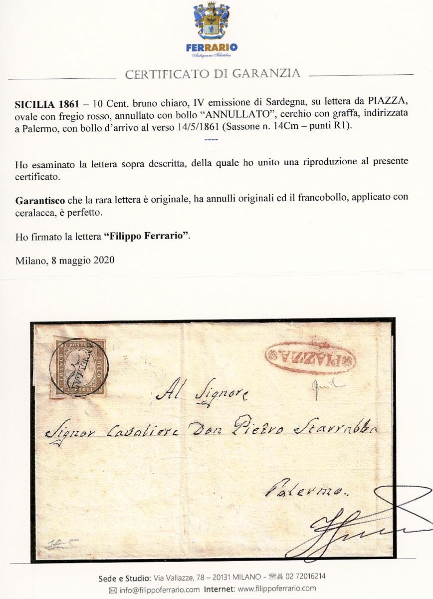 PIAZZA, "ANNULLATO" cerchio con graffa + ovale con fregi rosso, punti R1 - 10 cent. bruno chiaro (14Cm), perfetto, su fresca lettera diretta a Palermo, bollo d'arrivo del 14/5/1861. Il francobollo fu applicato con ceralacca. Bellissima e pochissime lettere note. Cert. Ferrario, ex collez. Nino Aquila.