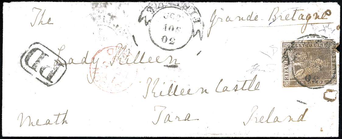 1859 - 9 crazie bruno lillaceo, filigrana linee ondulate (16), difetti di marginatura, isolato su piccola busta da Firenze 30/11/1859 per l'Irlanda. Si tratta dell' UNICA LETTERA NOTA affrancata con questo raro francobollo indirizzata in Irlanda! Da esposizione E.Diena, Chiavarello, cert. Ferrario. Ex coll. Imperato.