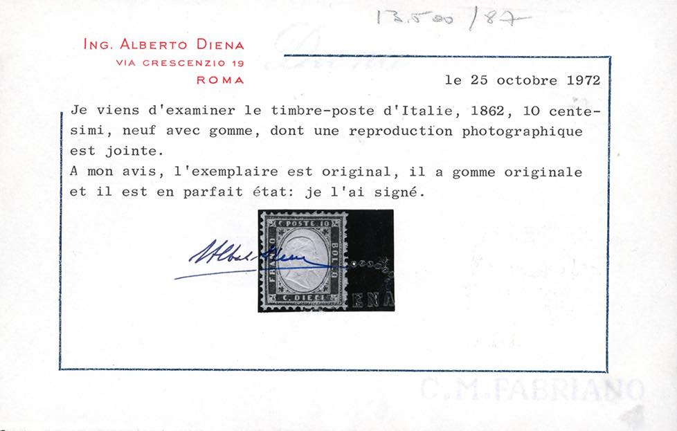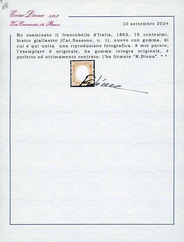 1862 - 10 cent. bistro giallastro (1), nuovo, gomma originale integra, perfetto e ottimamente centrato. Splendido e molto raro di questa qualità. Fiecchi, cert. A.Diena e Ferrario.