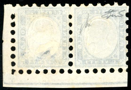 1862 - 20 cent. azzurro chiaro, prova di dentellatura 7 1/2 eseguito dalla tipografia Susse, coppia orizzontale con bordo integrale in ... Read more
