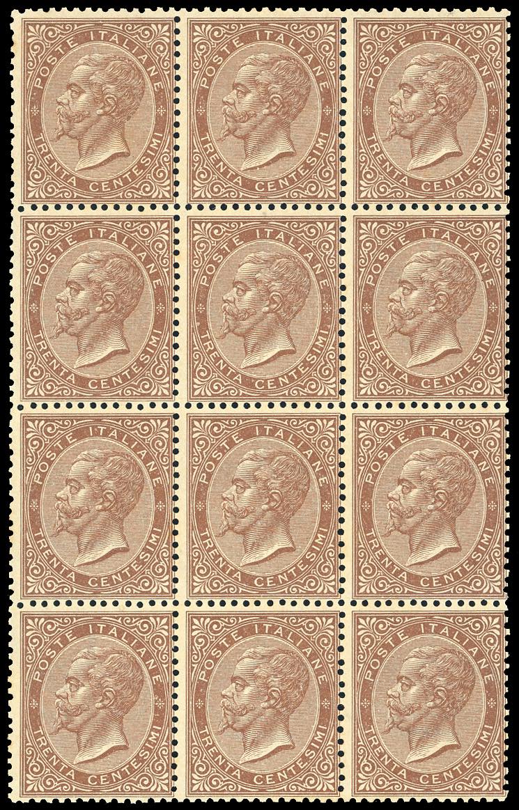 1866 - 30 cent. De La Rue, tiratura di Torino (T19), blocco di 12 esemplari, gomma originale integra, perfetto. Ferrario.