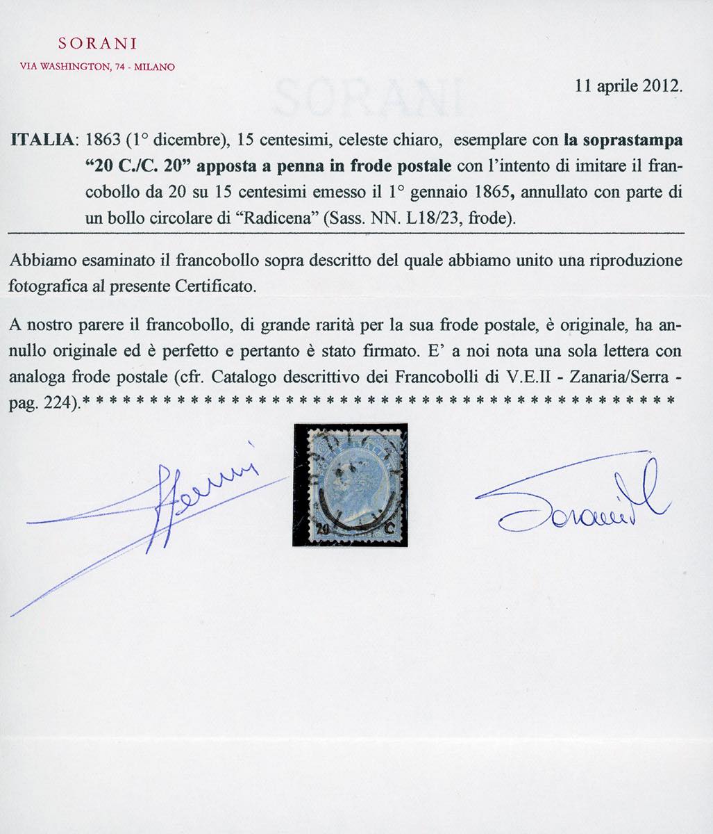 1865 - 20 cent. su 15 cent. Ferro di cavallo, falso dell'epoca con soprastampa apposta a penna in frode postale (F25), perfetto, usato a Radicena. Di questo falso si conoscono solo tre lettere oltre a questo esemplare usato, che è l'UNICO CON LA SOPRASTAMPA A MANO DEL VALORE SOLO IN BASSO. Eccezionale! Cert. Sorani.